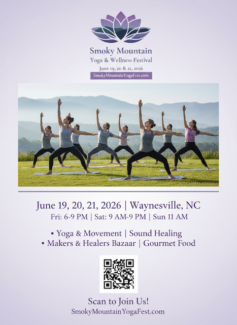 The 2nd Annual Smoky Mountain Yoga & Wellness Festival will be June 19, 20 and 21, 2026, in Waynesville, North Carolina, celebrating International Day of Yoga and Summer Solstice with a weekend of body and mind movement, workshops, fitness classes, sound healing sessions, breathwork, wellness education, hiking, entertainment, art and more.